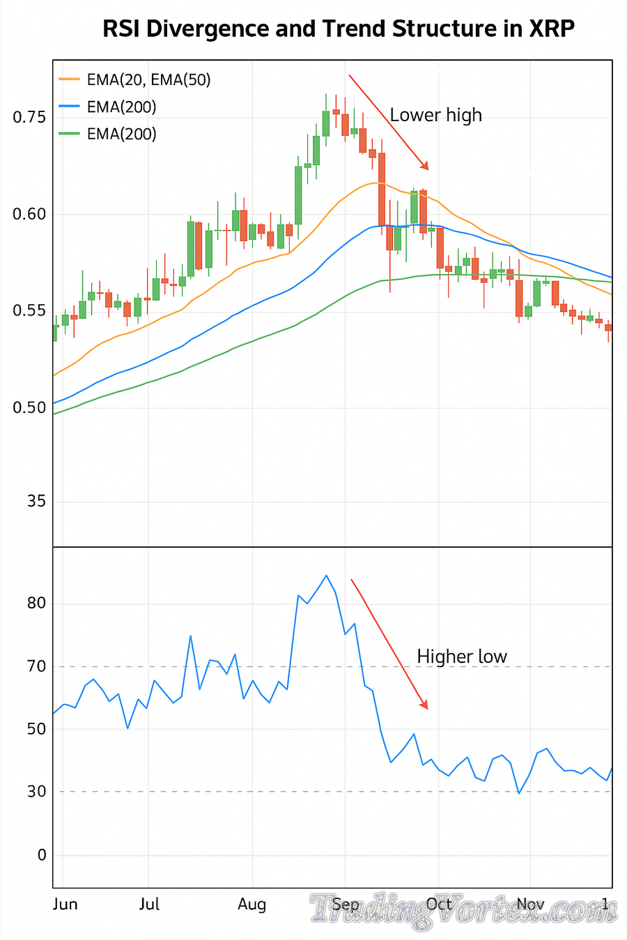 RSI Divergence and Trend Structure in XRP, June–November 2025: XRP daily candlesticks with EMA 20 orange, EMA 50 blue, EMA 200 green, RSI below with divergence callouts.