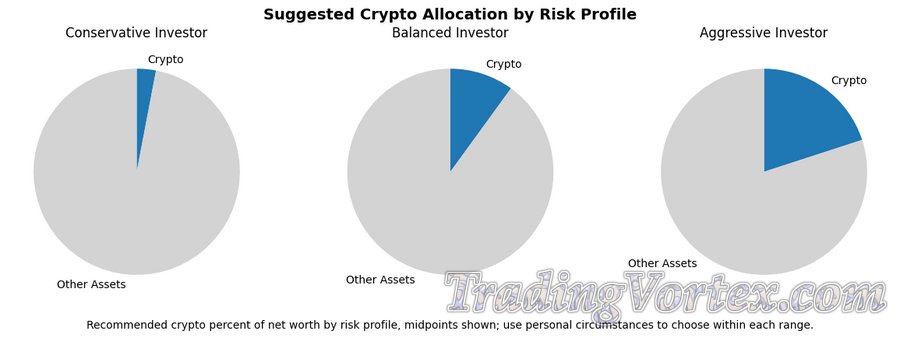Below are three example allocations you can adapt by risk appetite and horizon; they are illustrative templates not investment advice. All sample portfolios keep an emergency cash buffer outside crypto.